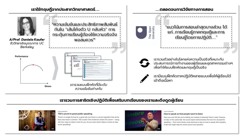 หลักสูตรนี้ใช้แนวการสอนแบบทฤษฎีทางประสาทวิทยาล่าสุดและคำแนะนำเชิงปฏิบัติจาก TED Talks และอื่นๆ เพื่อให้ผู้เข้าร่วมได้ลงมือปฏิบัติ